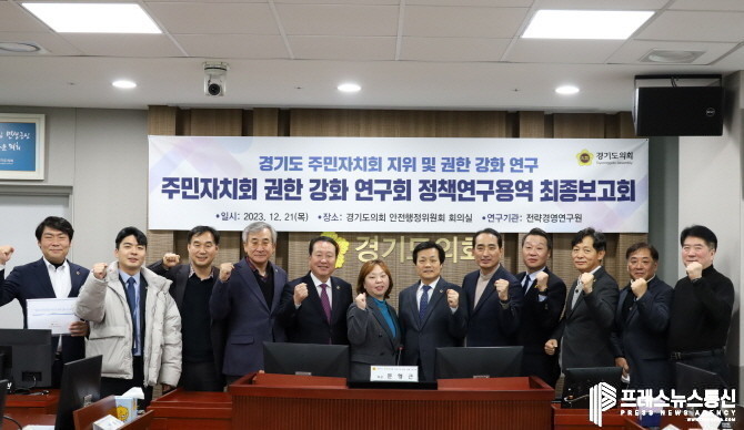 [프레스뉴스] 김대일 기자= 경기도의회 안전행정위원회 문형근 의원(더불어민주당, 안양3)이 회장으로 있는 ‘주민자치회 권한 강화 연구회’는 지난 21일 안전행정위원회 회의실에서 최종보고회를 개최했다.