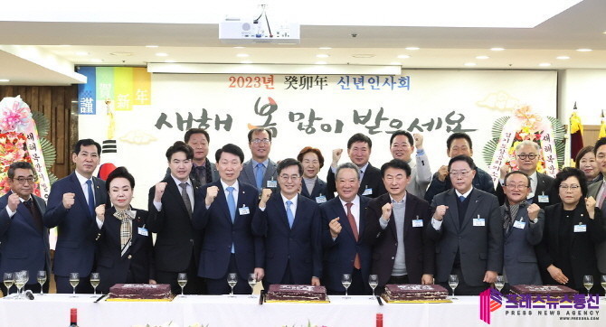 | ▲ 10일 오전 경기북부상공회의소 대강당에서 열린 경기북부상공회의소 신년인사회에서 김동연 경기도지사, 최근수 경기북부상공회의소 회장, 최영희 국회의원, 김민철 국회의원 , 오영환 국회의원, 김동근 의정부시장,강수현 양주시장, 김덕현 연천군수 등 관계자들이 기념촬영을 하고 있다.(사진=경기도) |