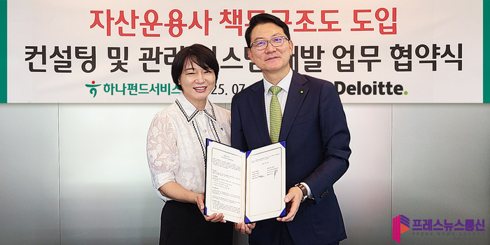[프레스뉴스] 류현주 기자= 하나금융그룹 관계사 하나펀드서비스(대표이사 김덕순)는 지난 25일 딜로이트 안진회계법인(대표이사 홍종성, 이하 딜로이트 안진)과 금융사 책무구조도 컨설팅 및 관리시스템 개발을 위한 업무협약(MOU)을 체결했다고 밝혔다.