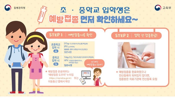 중학교 입학생은 11~12세 예방접종인 ▲Tdap(파상풍·디프테리아·백일해) 또는 Td(파상풍·디프테리아) 6차 ▲일본뇌염 불활성화 백신 5차(또는 약독화 생백신 2차), ▲ HPV(사람유두종바이러스) 1차(12세 여학생만 해당) 등 3종을 모두 접종했는지 확인해야 한다.