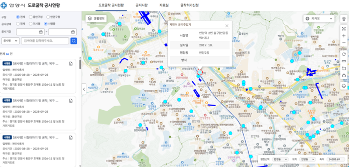 ▲도로굴착 공사현황 사이트에서 볼 수 있는 도로굴착 현황(사진=안양시) |