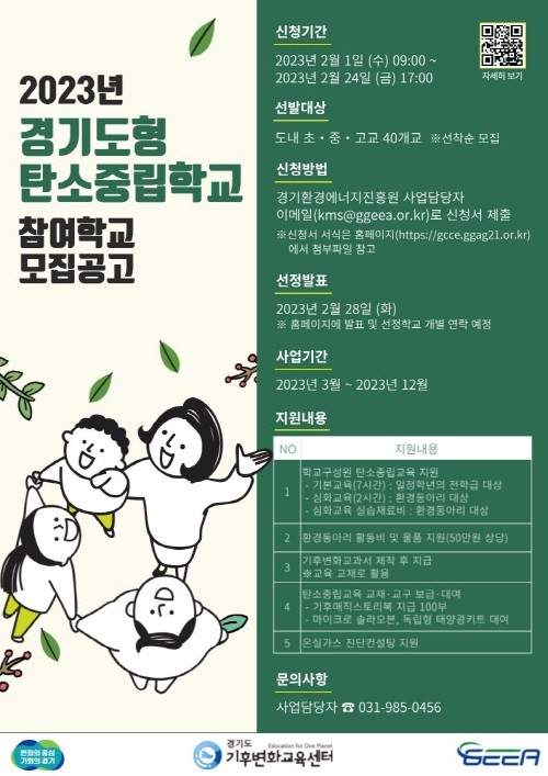 선정 발표는 2월 말 경기도기후변화교육센터 누리집에서 확인할 수 있다. 보다 자세한 내용은 경기도 누리집, 경기도기후변화센터 누리집 참여학교 모집 공고문에서 확인할 수 있다.