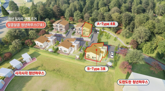 군은 기존 청년 주거단지와 커뮤니티센터 부지 내에 ‘알콩달콩 청년하우스’를 신축할 계획이며, 1~2층 규모로 총 7가구가 공급될 예정이다. 준공은 2027년 상반기를 목표로 하고 있다.