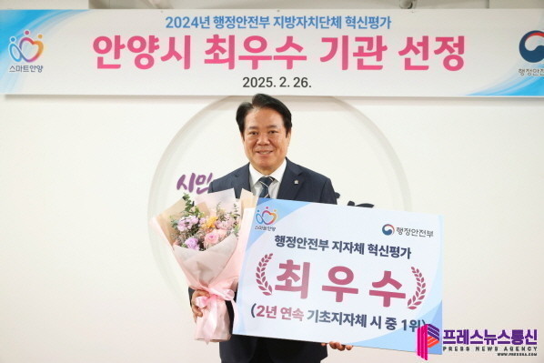 [프레스뉴스] 장현준 기자= 안양시가 행정안전부 주관 ‘2024년도 지방자치단체 혁신평가’에서 전국 기초지자체의 시 75곳 가운데 1위에 오르며 최우수기관으로 선정됐다고 27일 밝혔다.
