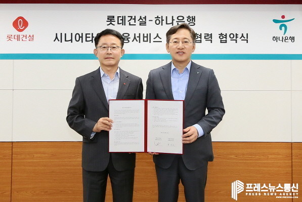 [프레스뉴스] 김대일 기자= 하나은행(은행장 박성호)은 지난 28일 오후 서울 서초구 롯데건설 본사에서 롯데건설(대표이사 하석주)과 시니어 손님 대상으로 최적의 맞춤형 자산관리 서비스 제공을 위한 업무협약을 체결했다고 밝혔다.