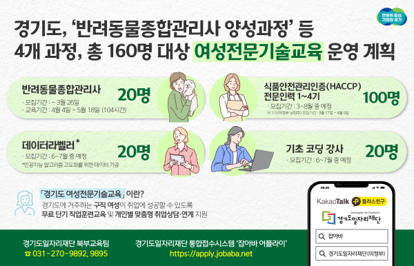 교육과정은 ▲반려동물 종합관리사(20명) ▲식품안전관리인증(HACCP) 전문인력(100명) ▲데이터라벨러(인공지능 알고리즘 고도화를 위한 데이터 가공 작업·20명) ▲기초 코딩 강사(20명) 등 4개 과정 총 160명 규모다. 도는 최신 일자리 동향 및 여성 구직자의 수요를 반영해 교육과정을 구성했다.