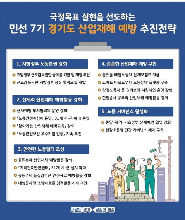 이에 도는 ①지방정부 노동분권 강화 ②선제적 산업재해 예방활동 강화 ③안전한 노동일터 조성 ④촘촘한 산재예방 구현 ⑤노동거버넌스 활성화 등 5개 분야를 주요 방향으로 설정, 다양한 정책과 사업을 추진한다.