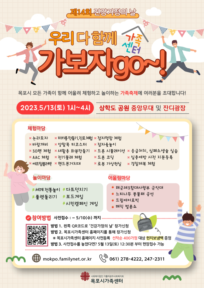 [전남=프레스뉴스] 이광남 기자= 목포시가족센터(센터장 최성숙)가 제14회 건강 가정의 날 가족 축제인 ‘우리 다 함께 가보자 go~!’를 개최한다.