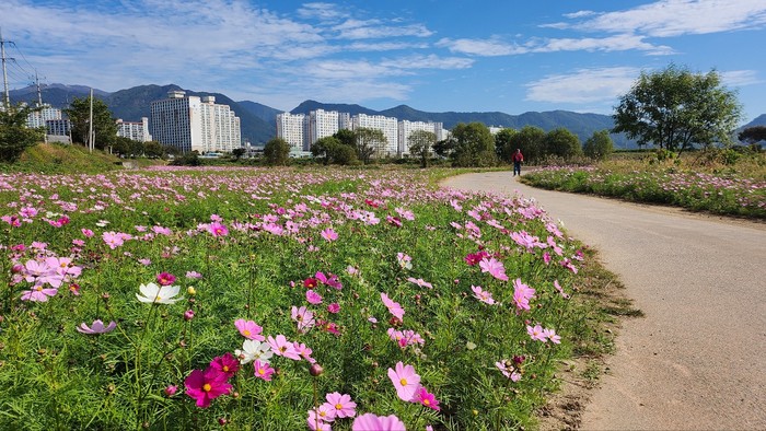 지난 8월부터 화순천 산책로 주변 정지작업을 시작으로 화순천 외제방부터 벌고천까지 1만2490㎡ 면적에 키가 작은 코스모스를 파종했고, 10월까지 관수, 제초, 병·해충 방제 작업 등을 진행해 가을 향 물씬 나는 꽃길을 완성했다.