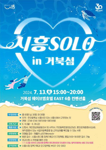 [프레스뉴스] 장현준 기자= 시흥시(시장 임병택)는 시화호 30주년을 기념해 아름다운 거북섬에서 결혼 적령기 미혼 남녀에게 소중한 인연을 만날 기회를 제공하고 결혼 친화 분위기를 조성하는 행사인 ‘시흥 솔로(SOLO) 인(in) 거북섬’에 참여할 미혼남녀 시흥시민을 모집한다.