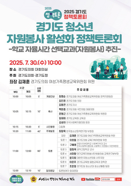 한편 이번 토론회는 경기도 청소년 정책에 관심 있는 누구나 참석할 수 있으며, 유튜브 ‘경기도의회’ 공식 채널을 통해 실시간 생중계될 예정이다.