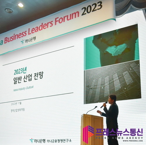| ▲ 하나은행은 지난 22일 대전 유성컨벤션웨딩홀에서 지역 기업인을 위한 『Hana Business Leaders Forum 2023』을 개최했다. 김문태 하나금융경영연구소 연구위원이 '2023 일반산업 전망'이라는 주제로 강연을 하고 있다.(사진=하나은행) |