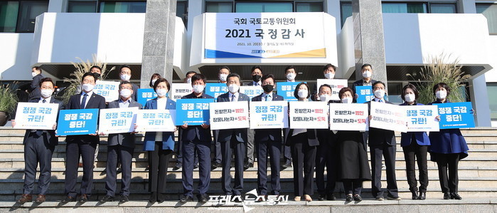 | ▲ 경기도의회 더불어민주당 대표단, 국토위 국감장 앞에서 “정쟁국감 중단” 피켓시위 진행(사진=경기도의회) |