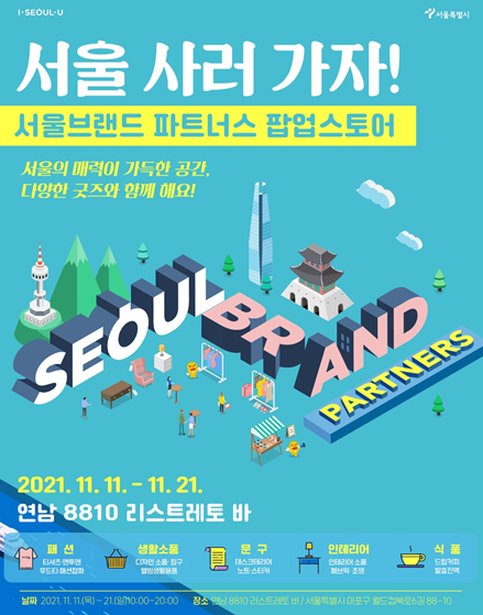 ‘서울브랜드 파트너스 팝업스토어’는 연남동 경의선 숲길공원 인근의 카페 ‘8810 리스트레토 바’에서 11월 11일부터 21일까지 11일간 개최되며, 19개 기업과 2팀의 대학생이 개발한 협업제품 50여종을 만나볼 수 있다.