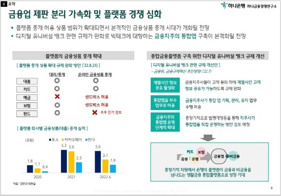대출, 카드에 이어 예금, 보험의 플랫폼 중개가 허용되면서 빅테크와 금융회사의 경쟁이 심화됨과 동시에 금융 산업의 제판분리도 가속화될 것으로 예상했다. 또한, 금융회사들도 디지털 유니버셜 뱅크 관련 규제 완화에 따라 금융과 비금융을 아우르는 통합앱을 구축하고, 디지털 자산, 헬스케어 등 신사업에도 박차를 가할 것으로 전망했다.