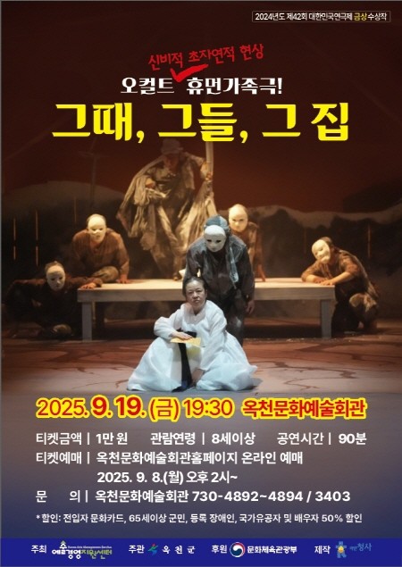 [프레스뉴스] 류현주 기자= 옥천군이 오는 9월 19일 오후 7시 30분, 옥천문화예술회관에서 열리는 오컬트 휴먼가족극 ‘그때, 그들 그집’ 공연의 예매를 8일부터 시작한다.