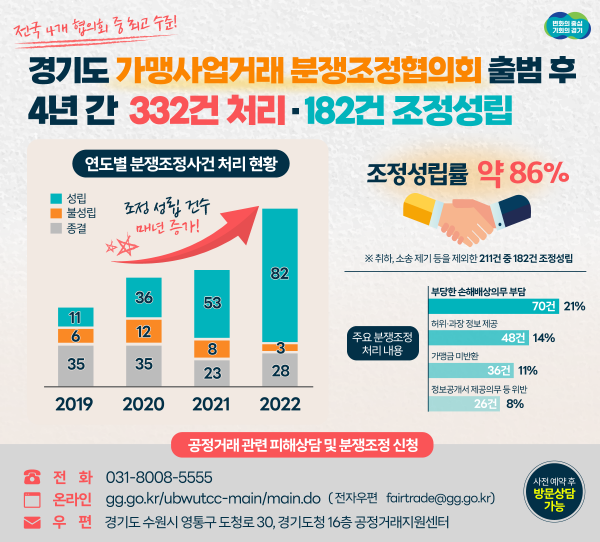 | ▲ 경기도 가맹사업거래 분쟁조정협의회 출범 후 4년간 332건 처리·182건 조정성립 그래픽자료(사진=경기도) |