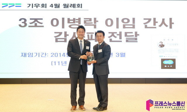 ▲김진경 경기도의회 의장이 25일 경기도경제과학진흥원에서 열린 경기도 기우회 4월 월례회에서 이병락 이임 간사 에게 감사패를 전달하고 있다.(사진=경기도의회) |