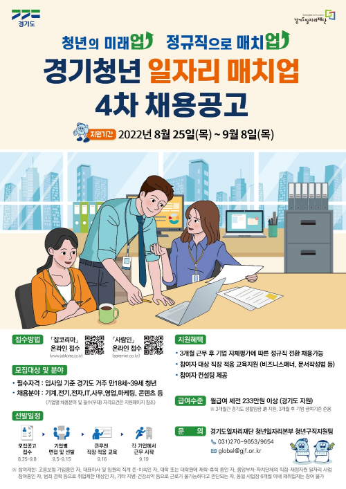 모집에 대한 자세한 내용은 잡아바, 사람인을 참고하거나 경기도일자리재단으로 문의하면 된다.