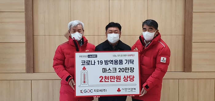 [전남=프레스뉴스] 강래성 기자= 지오씨(주)(대표 박인철)이 전남사회복지공동모금회(회장 노동일, 이하 전남 사랑의열매)에 코로나19 방역을 위한 마스크 20만장을 기탁했다.