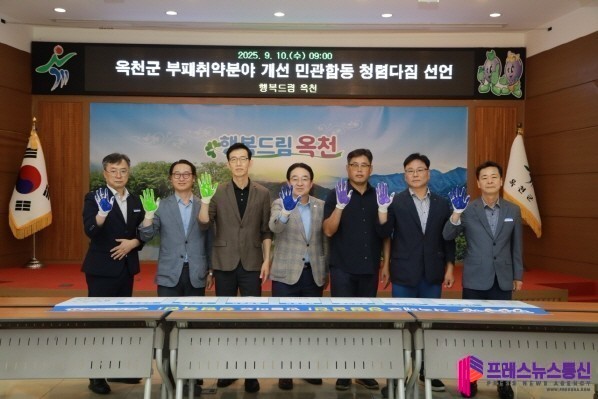 [프레스뉴스] 류현주 기자= 옥천군이 10일 옥천군청 대회의실에서 건축‧토목 부패 취약분야인 불법하도급 및 인허가의 투명성과 공정성을 높이기 위해 ‘민·관 청렴다짐 결의대회’를 개최했다.