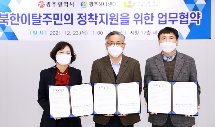 [광주=프레스뉴스] 강래성 기자= 광주광역시는 23일 시청 세미나실에서 광주하나센터, 광주광역시비정규직지원센터와 업무협약을 체결하고 북한이탈주민의 지역사회 안정적 정착을 위해 협력 관계를 강화키로 했다.