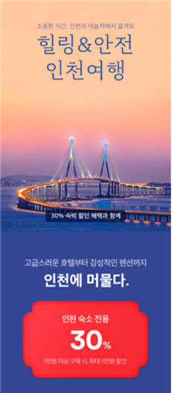 350여 개의 인천지역 숙박시설을 최대 5만원 할인된 금액으로 이용할 수 있는 ➀인천 숙박상품 기획전을 비롯해 ➁인천시티투어버스와 ➂투어패스 할인 이벤트를 진행한다.