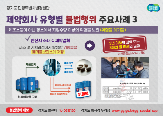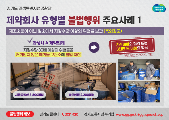 안산시에 위치한 C 제약업체는 허가받지 않은 폐기물 보관장소에 노말헵탄 등 지정수량 10.5배에 해당하는 제 4류 위험물을 저장하다, 안산시에 위치한 다른 D 제약업체는 폭발성 등 위험성이 높아 함께 저장해서는 안 되는 에탄올(제4류 위험물)과 유황, 철분(제2류 위험물)을 함께 저장하다 적발됐다.