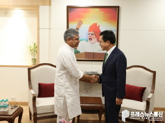 | ▲ 현지시간 지난 4일 오후 인도를 방문한 김동연 경기도지사가 아쉬위니 바이쉬나우 인도 전자정보기술부 장관과 인사를 나누고 있다.(사진=경기도) |