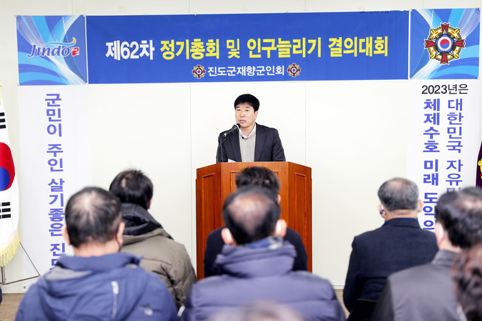 진도군 재향군인회는 인구 늘리기를 위한 결의대회를 열고, 한마음 한뜻으로 함께 앞장설 것을 다짐하는 결의문을 채택했다.