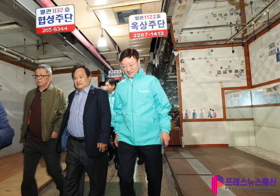 | ▲ 이승열 하나은행장(사진 맨 오른쪽)이 3일 오전 서울 광장시장을 방문하여 과거 평당 1억5천만원에 매매가 이뤄졌지만 현재는 공실로 남은 직물 상가를 시장 상인들과 함께 둘러보고 있다.(사진-하나은행) |