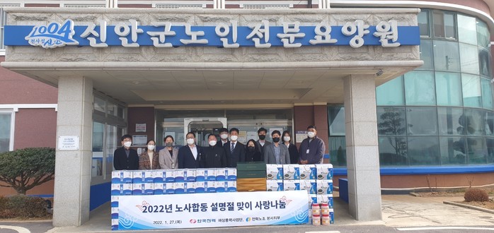 [전남=프레스뉴스] 강래성 기자= 신안군은 지난 27일, 한국전력공사 해상풍력사업단(단장 김종화) 및 본사지부(위원장 김강정, 김성록)에서 설명절을 앞두고 신안지역 사회 취약계층에 대한 사랑나눔을 위해 노인요양시설, 장애인거주시설 및 아동양육시설을 대상으로 5백만원 상당의 신안군수협 특산품을 구매하여 전달하였다고 밝혔다.