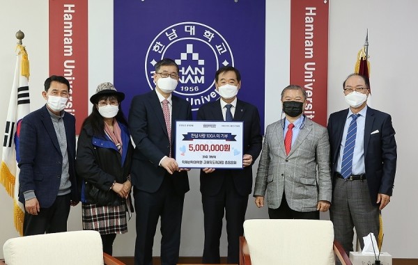 한남대는 학제신학대학원 총동문회가 5일 오후 1시 30분 본관 2층 총장접견실에서 발전기금 전달식을 갖고 이광섭 총장에게 500만원의 발전기금을 전달했다고 밝혔다.
