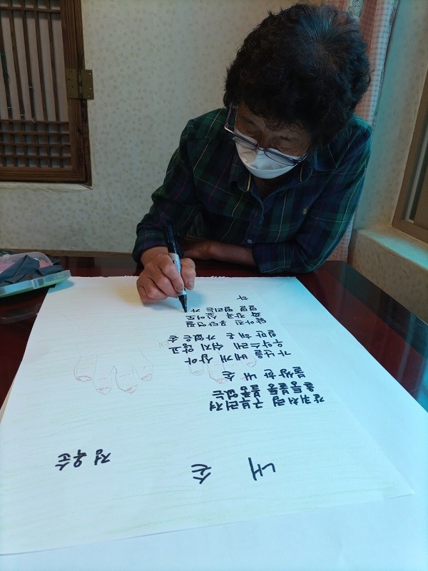 | ▲ 충북 단양 정옥순 할머니가 작품 ‘내손’을 써내려가고 있다.사진=단양군 |