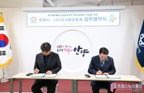 [프레스뉴스] 장현준 기자= 안양시(시장 최대호)는 30일 오전 10시 시청 3층 접견실에서 (사)다사랑공동체(회장 성재호)와 ‘주거취약계층 공공임대주택 입주보증금 지원을 위한 업무협약’을 체결했다.