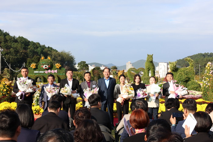 한편, 국화 축제는 11월 17일까지 진도개테마파크, 향토문화회관, 철마공원 일원에서 진행하며, 작년과 비교해 전시회 규모를 30% 이상 확대했다. 농업기술센터에서 재배한 국화와 농가소득을 증대하기 위해 농가에 위탁하여 생산한 국화 등 국화 13만 본으로 만든 다양한 작품을 7개 정원에 전시 중이다.