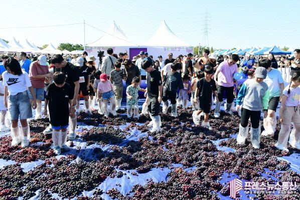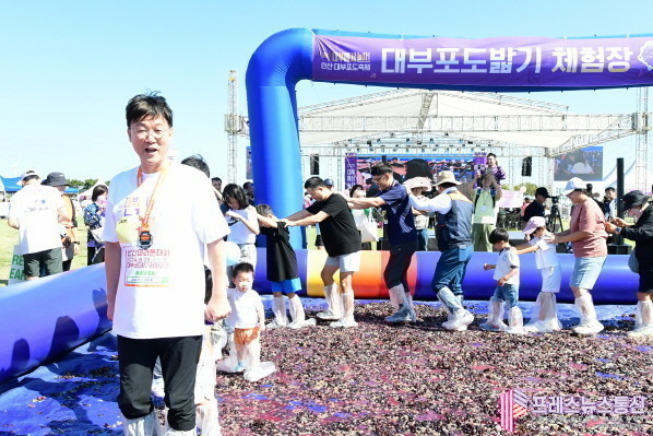 | ▲지난 28일부터 29일까지 이틀간 대부바다향기테마파크 일원에서 열린 2024 안산 대부포도 축제(대부포도 밟기 댄스타임)사진=안산시 |