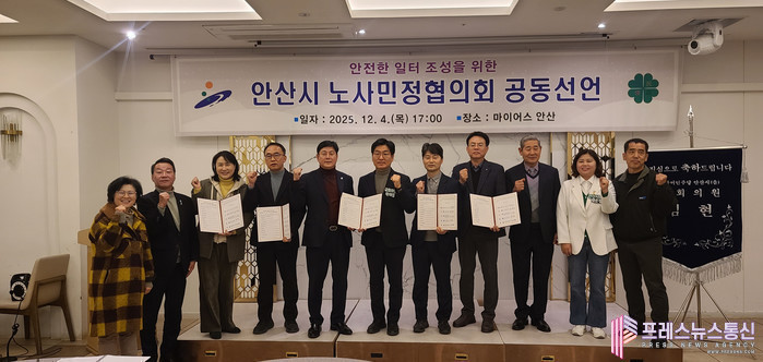 [프레스뉴스] 장현준 기자= 안산시(시장 이민근)는 안산시노사민정협의회가 지난 4일 마이어스 안산에서 ‘2025년 노사민정협의회’를 개최하고 ‘노사상생 협력 공동선언문’을 발표했다고 9일 밝혔다.