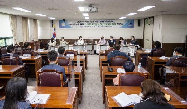 | ▲ 안산시의회 의원연구단체 ‘안산 지방분권 의원 연구모임’이 20일 의회 대회의실에서 ‘지방분권을 위한 안산형 주민자치 발전 방향과 과제 토론회’를 개최했다. 사진은 이날 토론회 중 한 장면. |