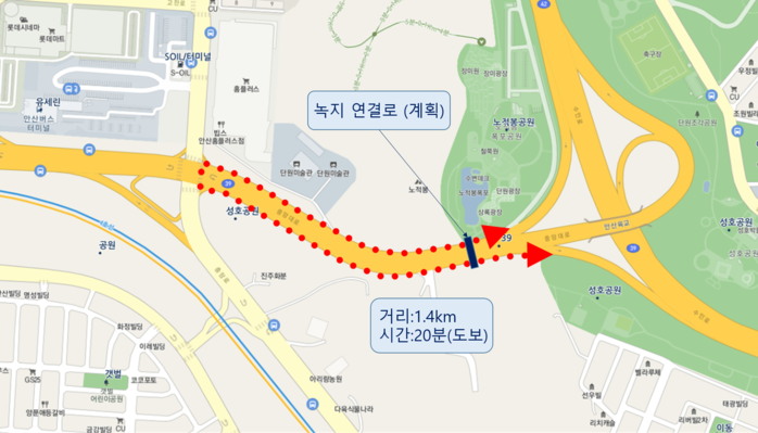 현재 노적봉 공원과 성호공원을 연속해서 이용하려면 왕복 8차로인 중앙대로 1.4km를 우회해야 한다. 이렇게 되면 도보로 왕복 40여 분이 소요되며, 교통사고 발생 우려 및 차량에서 발생하는 환경오염 물질 노출 위험이 있다. 이러한 문제점을 해결함은 물론, 보다 안전하고 쾌적한 공원 산책로 조성을 위해 추진하는 사업이다.