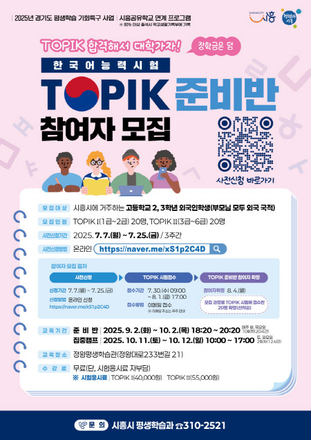 [프레스뉴스] 장현준 기자= 시흥시(시장 임병택)는 2025년 경기도 평생학습 기회특구 사업의 일환으로, 관내에 거주하는 고등학교 2~3학년 외국인 학생을 대상으로 ‘한국어능력시험(TOPIK) 준비반’을 운영한다.