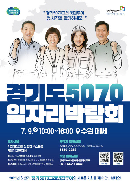 [프레스뉴스] 장현준 기자= 경기도가 9일 수원메쎄에서 ‘2025 경기도 5070 일자리 박람회’를 개최한다. 이번 박람회를 시작으로 도는 하반기 중 도내 31개 시군을 순회하는 ‘경기 5070 그레잇잡투어(Gray it-job tour)’를 추진한다.