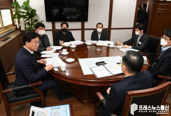 한국토지주택공사 서울지역본부 접견실에서 진행된 간담회에서 이민근 시장은 장상·신길2지구 사업과 관련된 현안에 대해 적극 설명했으며, 이한준 사장도 시의 의견을 적극 반영하기로 했다.