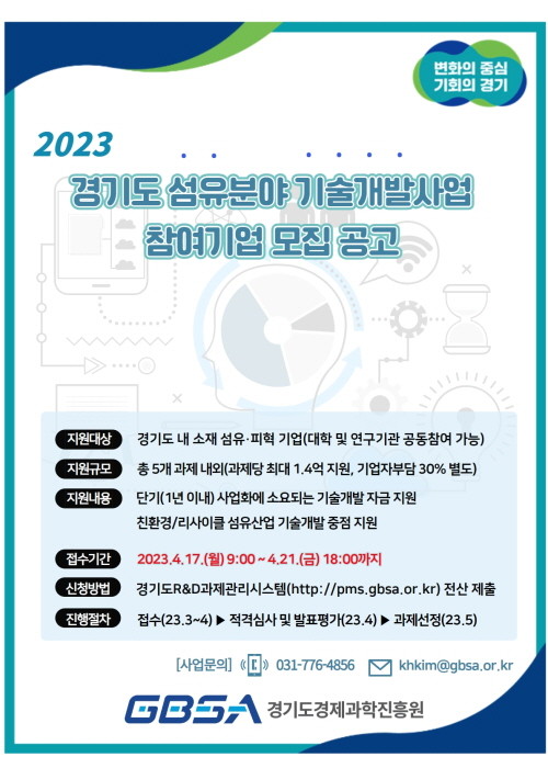▲2023 경기도 섬유분야 기술개발사업 참여기업 모집 공고 포스터(사진=경기도경제과학진흥원) |