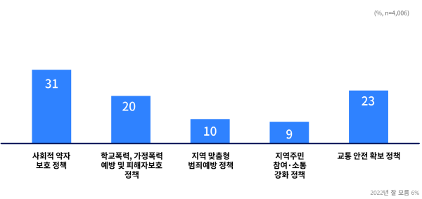 이어 교통안전 확보(23%), 학교폭력.가정폭력 예방 및 피해자보호(20%), 지역 맞춤형 범죄예방(10%), 지역주민 참여.소통 강화(9%) 순으로 응답했다.