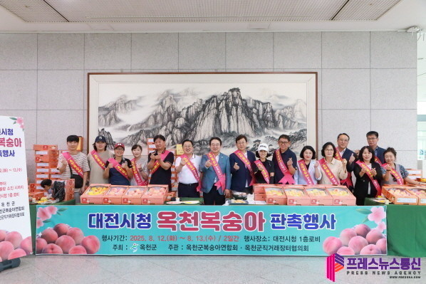[프레스뉴스] 류현주 기자= 옥천군은 농가소득 증대와 옥천 복숭아의 우수성 홍보를 위해 엄선된 최고 품질의 복숭아로 12일 대전시청에서 판촉 행사를 진행했다.