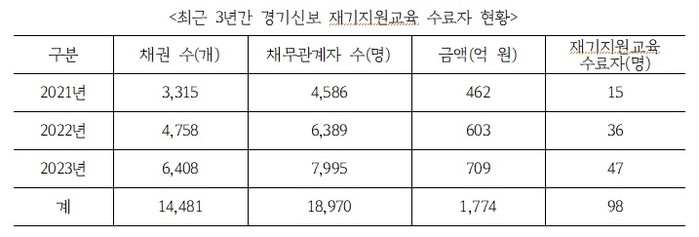 김태희 의원에 따르면, 경기신보의 최근 3년간 채권 소각 금액은 2021년 462억원, 2022년 603억원, 2023년 709억원으로 꾸준히 증가하여 누적 채권 소각 금액이 1,774억원에 달한다.