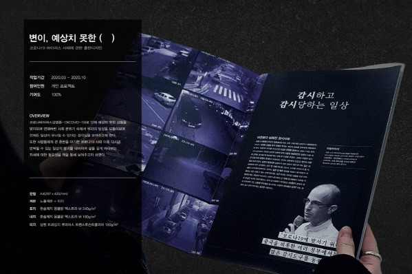 공모전에서 가장 높은 점수를 받은 작품은 편집디자인 분야로 강민지 씨가 출품한 ‘변이, 예상치 못한 ( )’이다. 이 작품은 코로나19와 같이 예상치 못한 상황에 대해 우리의 일상이 무너질 수 있다는 경각심을 표현했다. 시대적 상황을 반영한 주제선정과 여러 형태의 시각물 제작과정을 심도있게 담아내 주목을 받았다.