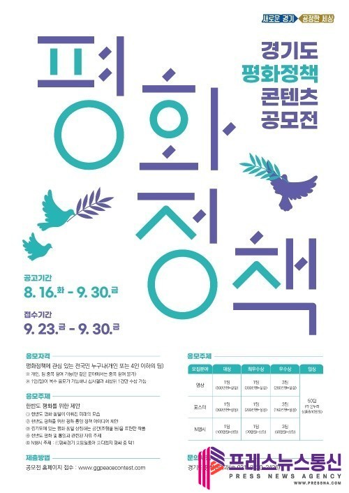 [프레스뉴스] 김대일 기자= 경기도가 평화정책에 대한 창의적인 아이디어를 도정에 반영하고 한반도 평화에 대한 국민 공감대 확산을 위해 ‘2022 경기도 평화정책 콘텐츠 공모전’을 개최한다고 31일 밝혔다.