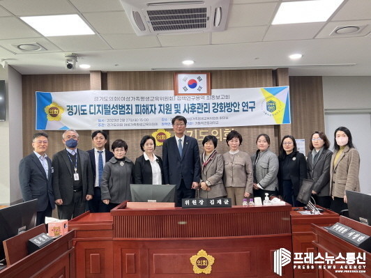 [프레스뉴스] 김대일 기자= 경기도의회 여성가족평생교육연구회(회장 김재균)는 지난 27일(월) 경기도의회 여성가족평생교육위원회 회의장에서 ‘경기도 디지털성범죄 피해자 지원 및 사후관리 강화방안 연구’(수탁기관: 가톨릭관동대학교 산학협력단)에 대한 정책연구용역 최종보고회를 개최하였다.
